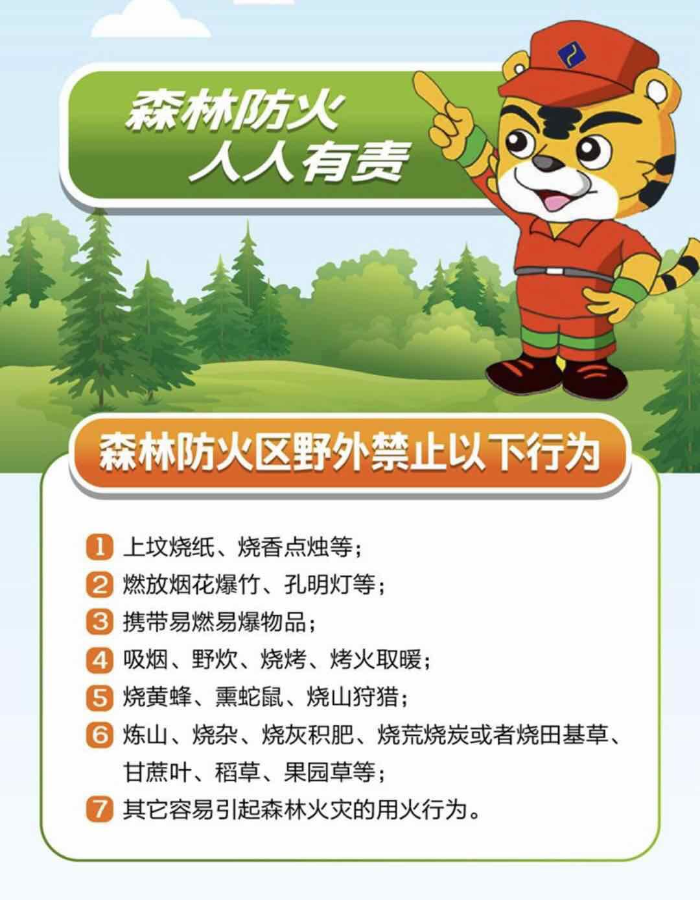 一、请广大市民谨记森林防火区和森林特别防护期。森林防火区为我市行政区域内的林地及距离林地边缘30米范围;森林特别防护期为每年10月1日至次年4月30日。在森林防火区和森林特别防护期内,未经批准,禁止一切野外用火。