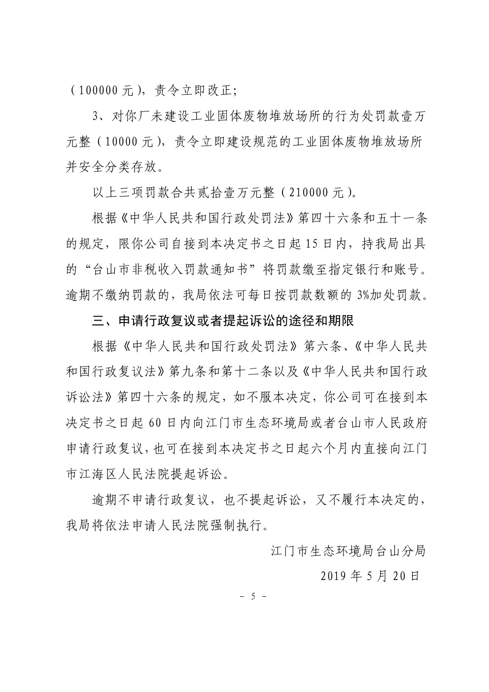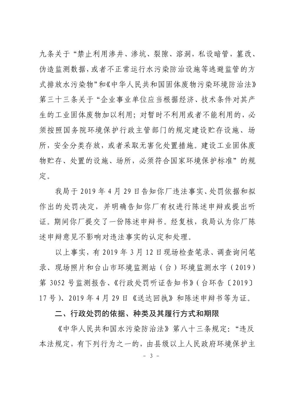 行政处罚决定书(台环罚〔2019〕16号)
