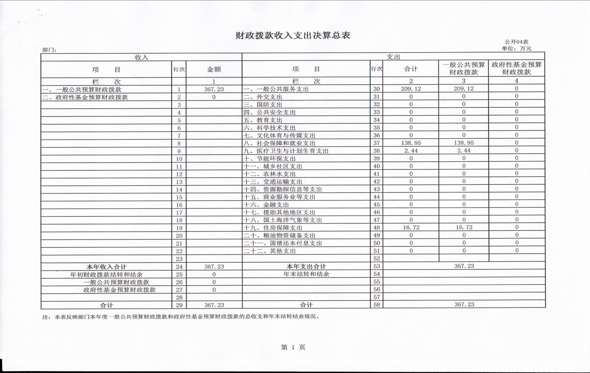 2016年财政拨款收入:367.23万元;2016年财政拨款支出:367.23万元,其中一般公共服务支出209.12万元、社会保障和就业支出138.95万元、医疗卫生和计划生育支出2.44万元、住房保障支出16.72万元。财政拨款结余为零。