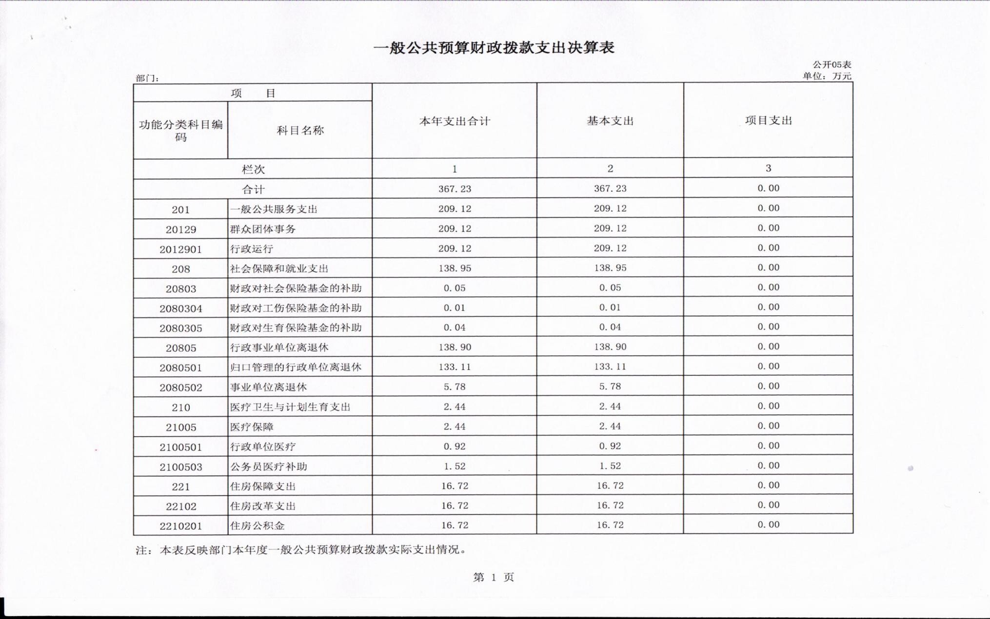2016年财政拨款支出:367.23万元,其中一般公共服务支出209.12万元、社会保障和就业支出138.95万元、医疗卫生和计划生育支出2.44万元、住房保障支出16.72万元。财政拨款结余为零。