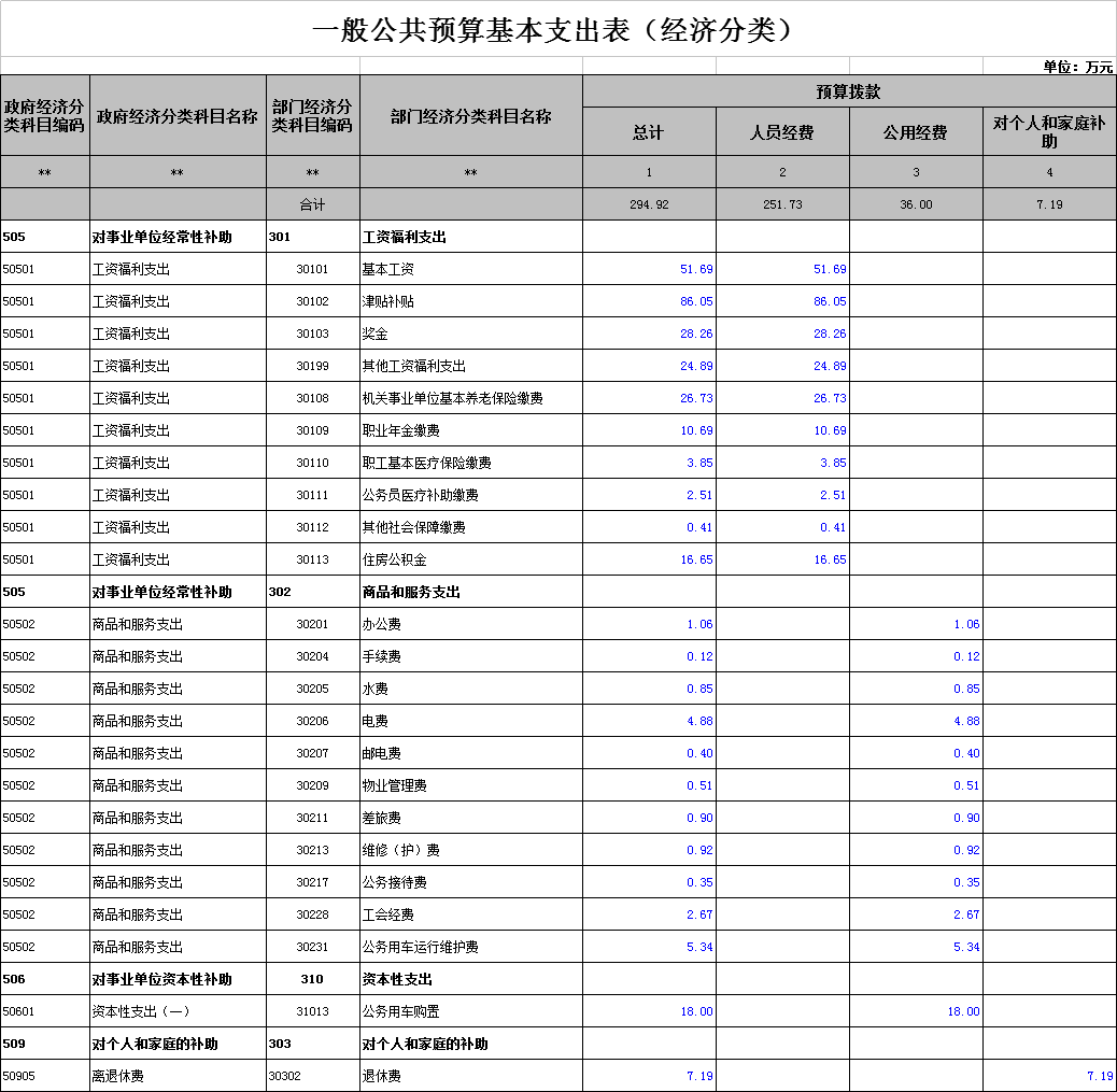 基本支出(含工资福利性支出、对个人和家庭补助支出和公用支出)294.92万元。