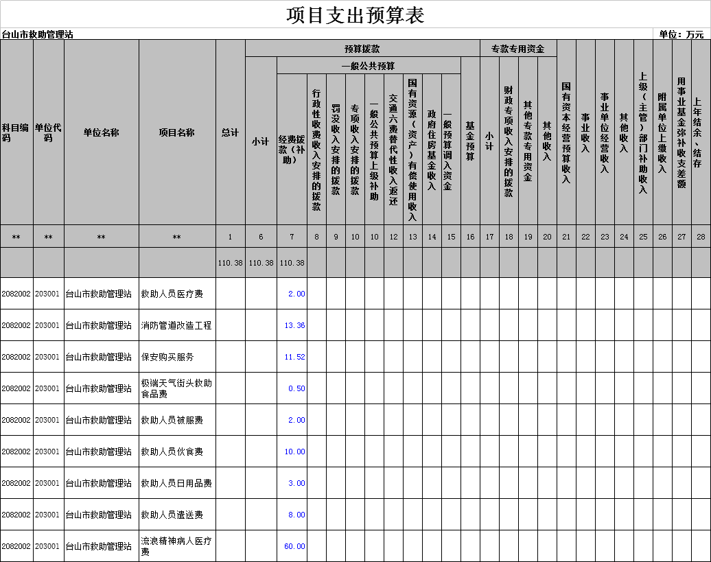 项目支出预算110.38万元,主要支出项目有:流浪乞讨人员救助支出110.38万元。