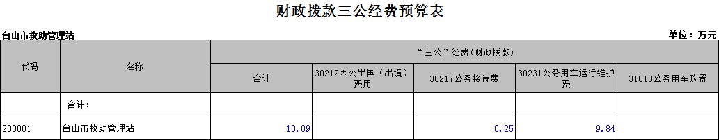 2018年台山市救助管理站用财政拨款数开支的因公出国(境)经费、车辆购置及运行费、公务接待费(简称“三公”经费)支出合计10.09万元。