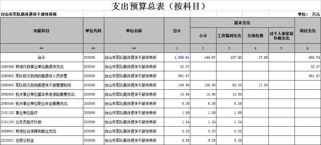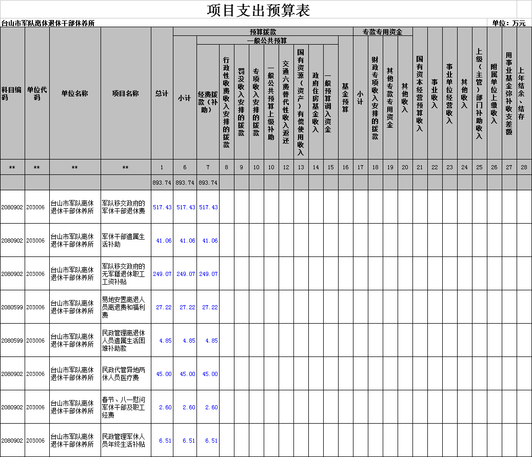 项目支出预算893.74万元,主要支出项目有:军队移交政府的军休干部退休费517.43万元,军休干部遗属生活补助41.06万元,军队移交政府的无军籍退休职工工资补贴249.07万元,易地安置离退人员离退费和福利费27.22万元,民政管理离退休人员遗属生活困难补助款4.85万元,民政代管异地两休人员医疗费45万元,春节、八一慰问军休干部及职工经费2.6万元,民政管理军休人员年终生活补贴6.51万元。