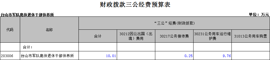 2018年台山市军休所用财政拨款数开支的出国(境)经费、车辆购置及运行费、公务接待费(简称“三公”经费)支出合计10.01万元。
