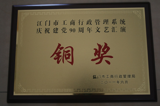 我局参加江门市工商局和江门个私协会举行的“党在我心中”庆祝建党90周年文艺汇演,广大青年干部以歌舞节目《党旗下的红盾儿女》参演并荣获比赛铜奖。