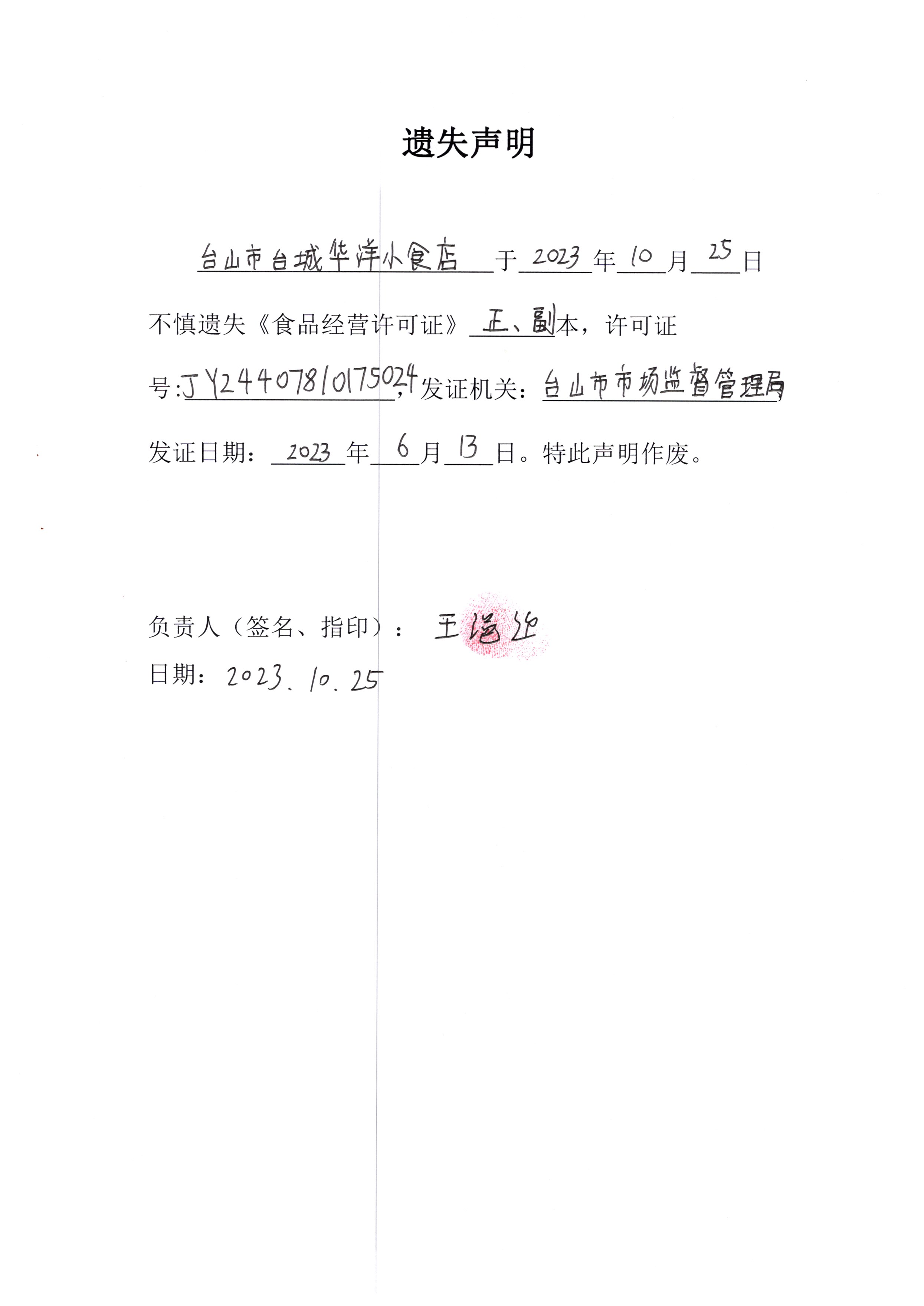 遗失声明——台山市台城华洋小食店