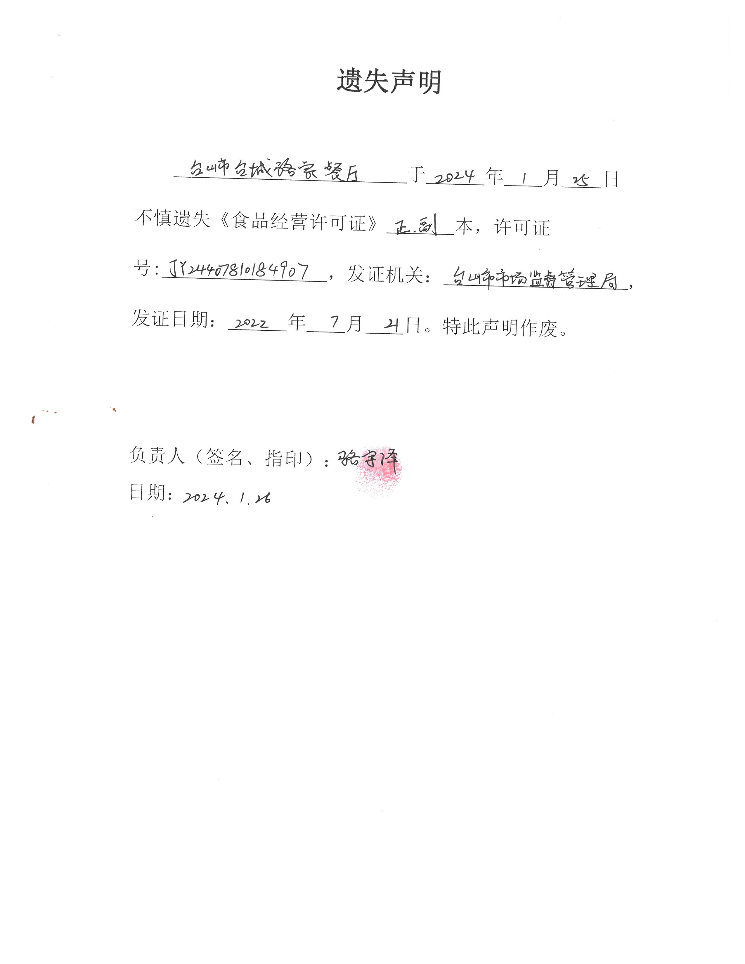 遗失声明——台山市台城骆家餐厅