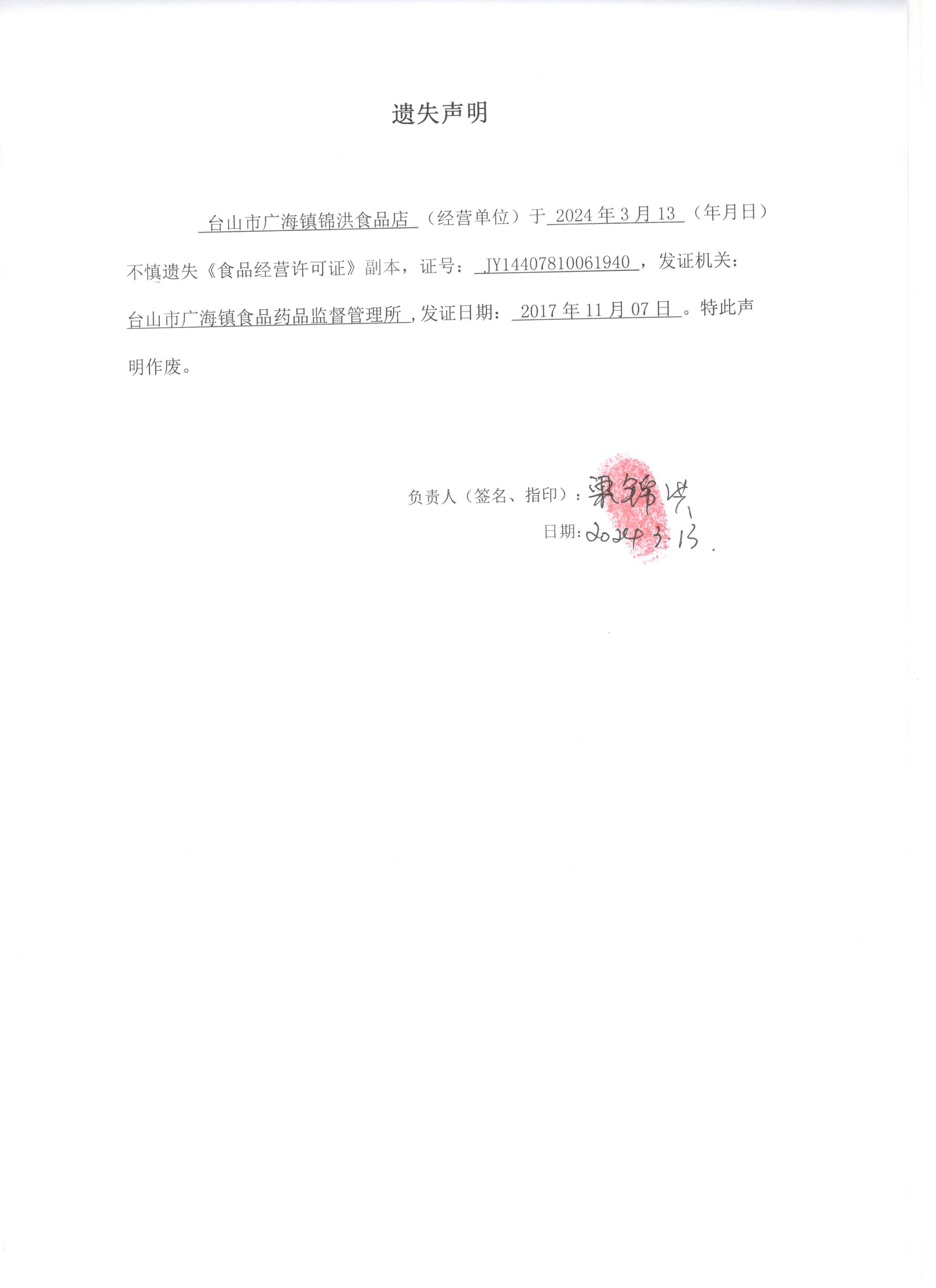 遗失声明——台山市广海镇锦洪食品店