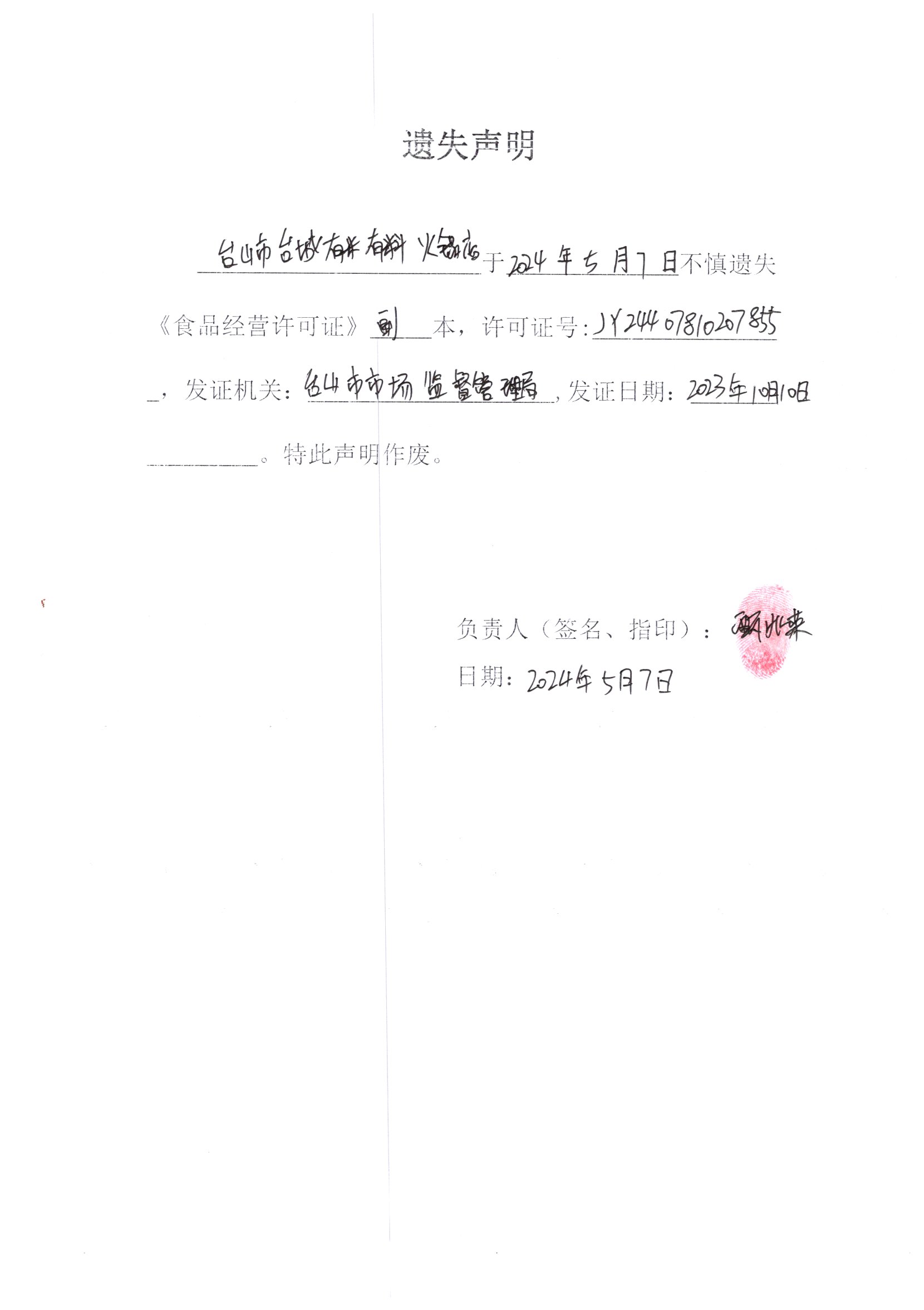 遗失声明——台山市台城有米有料火锅店