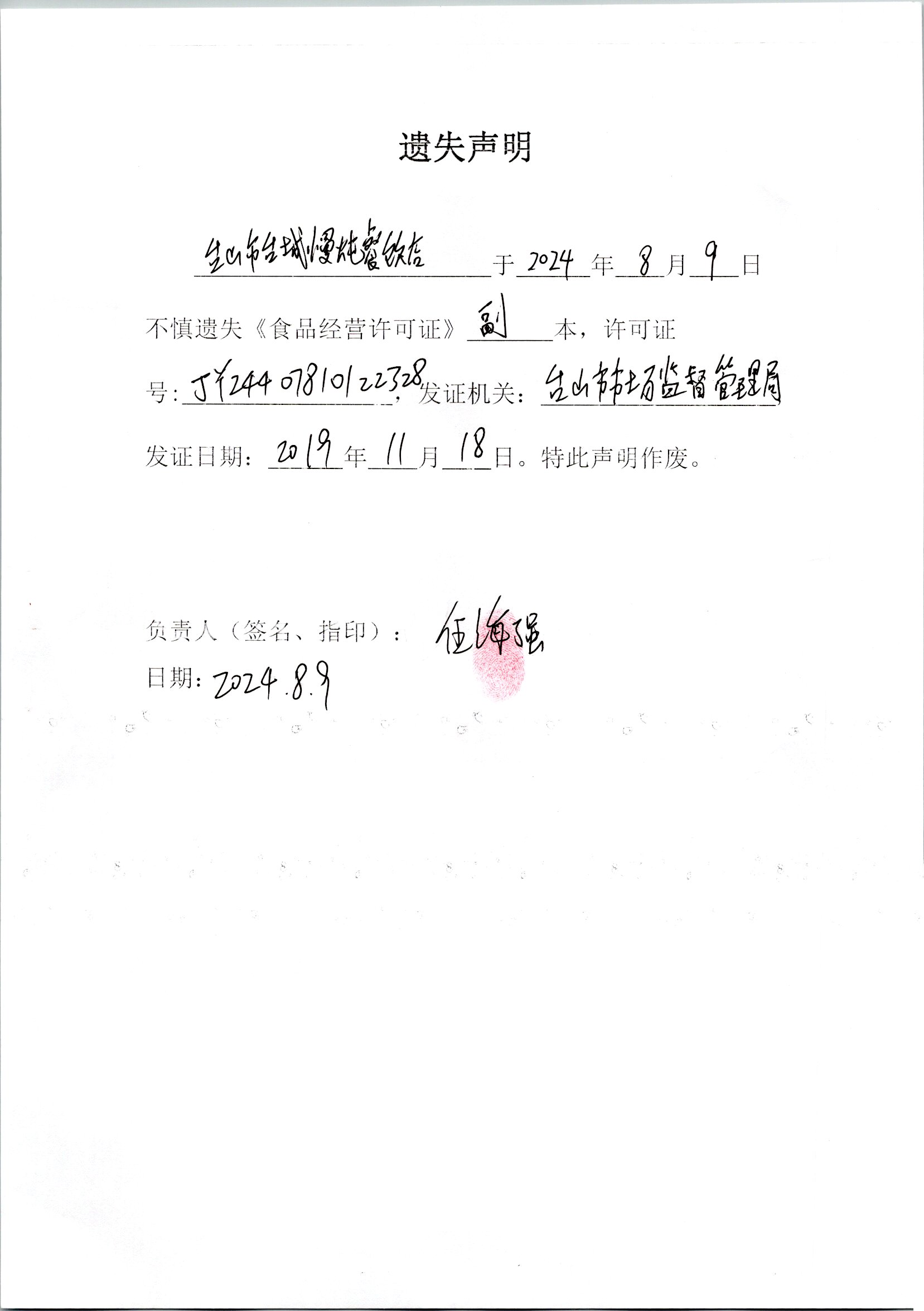 遗失声明--台山市台城慢炖餐饮店