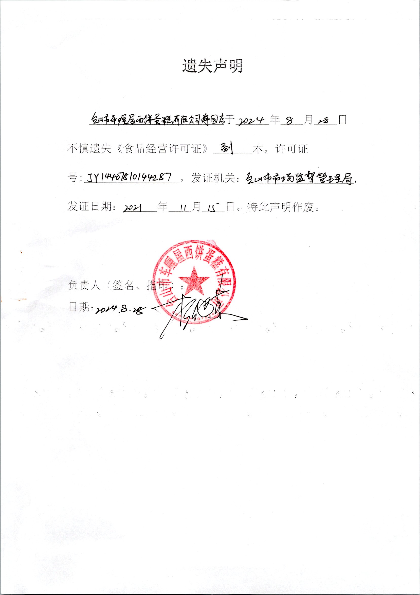 遗失声明——台山市车喱屋西饼蛋糕有限公司海园店
