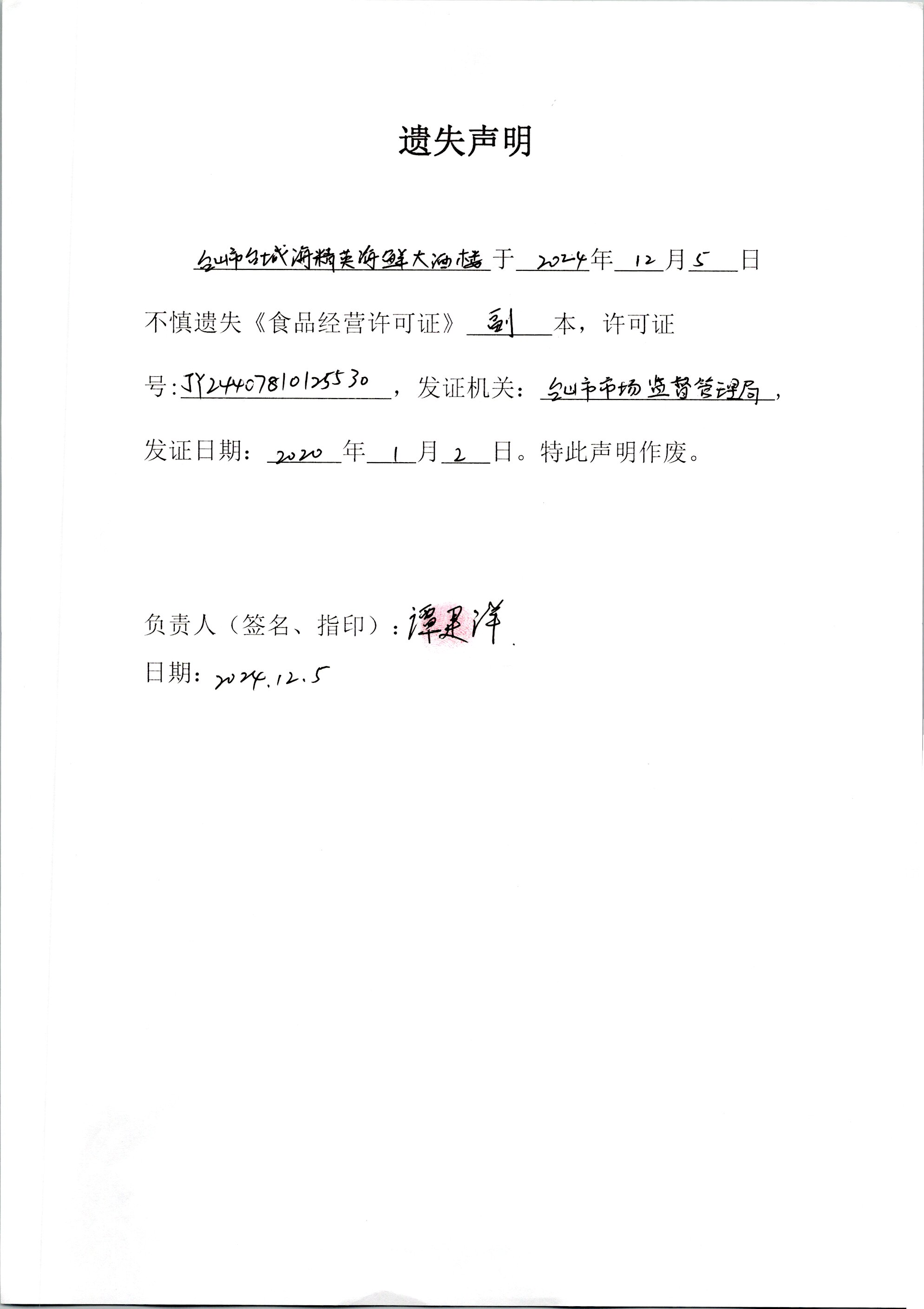 遗失声明——台山市台城海精英海鲜大酒楼