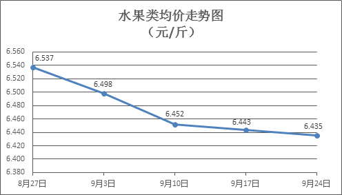 水果类商品价格窄幅盘降。上周所监测的6种水果商品价格波动情况为2涨4跌,综合零售均价为6.435元/斤,环比下降0.13%。其中橙子、香蕉、葡萄零售均价分别为每斤6.40元、3.08元、12.88元,环比分别下降0.31%、上涨1.32%、下降0.16%。