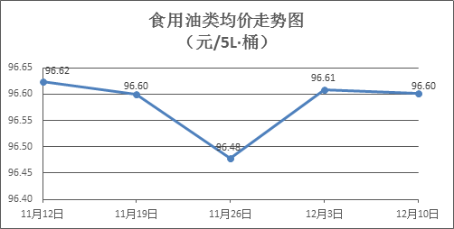 食用油类商品价格稳中略降。上周所监测的9种食用油(5L装)商品价格波动情况为1涨2跌6平,综合零售均价为96.60元/桶,环比下降0.01%。其中:鲁花花生油、玉米油零售均价分别为每桶157.19元、74.76元,环比分别持平、下降0.13%。