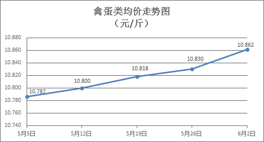 禽蛋类商品价格微幅上涨。所监测的6种禽蛋类商品价格波动情况为4涨2平,综合零售均价为每斤10.862元,环比上涨0.29%。其中:白条鸡、白条鸭零售均价分别为每斤20.04元、14.98元,环比分别上涨0.10%、持平;白壳鸡蛋、鸭蛋零售均价分别为每斤6.35元、7.52元,环比分别上涨0.95%、上涨1.08%。