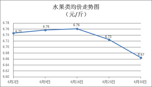 水果类商品价格略有下降。所监测的6种水果商品价格波动情况为2涨4跌,综合零售均价为每斤6.67元,环比下降0.89%。其中橙子、苹果、香蕉零售均价分别为每斤5.62元、7.48元、2.97元,环比分别下降0.71%、上涨0.13%、下降1.33%。