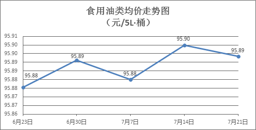 食用油类商品价格微幅波动。所监测的9种食用油(5L装)商品价格波动情况为3涨4跌2平,综合零售均价为每桶95.89元,环比下降0.01%。其中:胡姬花花生油、玉米油零售均价分别为每桶145.50元、76.85元,环比分别下降0.07%、下降0.13%。