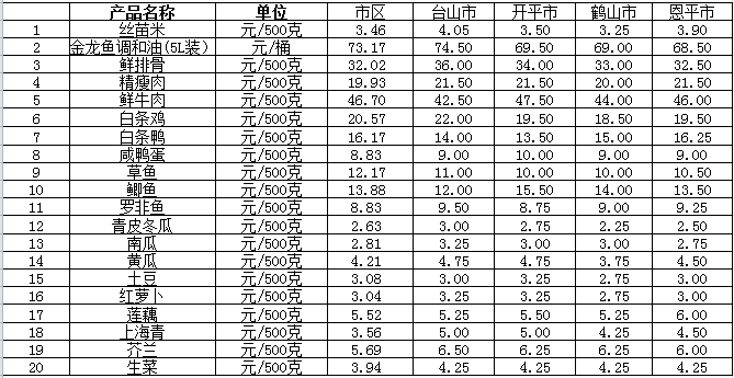 说明:1、表中价格为该地区监测点综合平均价;2、“市区”含蓬江区、江海区、新会区,价格分别采自蓬江市场、江南市场、城东市场等13家农贸市场;3、其他四个县市价格分别采自新华市场、锦江市场等8家农贸市场。