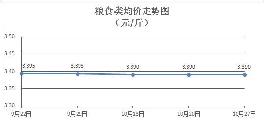 粮食类商品价格保持稳定。所监测的4种粮食类商品价格均持平,零售均价为每斤3.390元。其中:丝苗米、富强粉零售均价分别为每斤3.57元、3.36元,环比均持平。