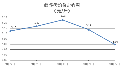 蔬菜类商品价格整体下降。所监测的32 种蔬菜商品价格波动情况为2涨26跌4平,综合零售均价为每斤5.00元,环比下降2.73%。其中:价格上涨的品种包括西芹、南瓜,零售均价分别为每斤6.13元、2.85元,环比分别上涨1.66%、0.35%;跌幅靠前的品种包括丝瓜、西洋菜、本地菜心,零售均价分别为每斤4.43元、5.92元、4.89元,环比分别下降9.96%、6.77%、6.68%。
