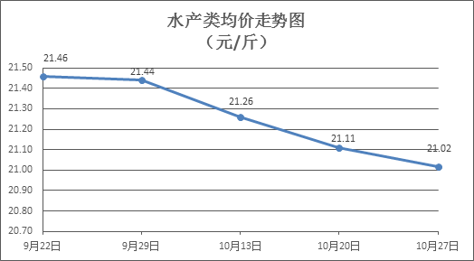 水产类商品价格以降为主。所监测的9种水产商品价格波动情况为1涨7跌1平,综合均价为每斤21.02元,环比下降0.44%。其中:草鱼、鲫鱼、罗非鱼、基围虾零售均价分别为每斤11.04元、13.76元、8.98元、30.25元,环比分别下降0.18%、下降0.79%、下降0.22%、下降0.79%。