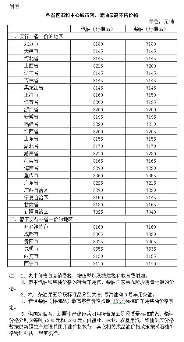 根据近期国际市场油价变化情况,按照现行成品油价格形成机制,自2017年11月2日24时起,国内汽、柴油价格(标准品,下同)每吨均提高150元。调整后,各省(区、市)和中心城市汽、柴油最高零售价格见附表。相关价格联动及补贴政策按现行规定执行。