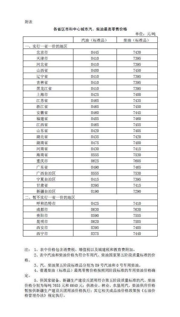 根据近期国际市场油价变化情况,按照现行成品油价格形成机制,自2017年11月16日24时起,国内汽、柴油价格(标准品,下同)每吨分别提高265元和250元。调整后,各省(区、市)和中心城市汽、柴油最高零售价格见附表。相关价格联动及补贴政策按现行规定执行。