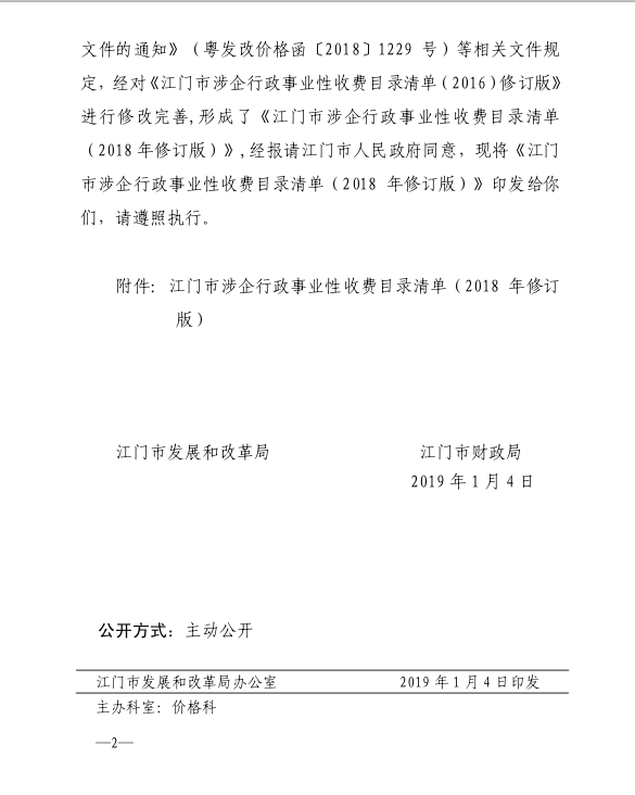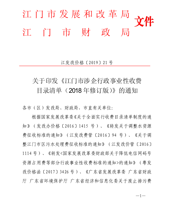 关于印发《江门市涉企行政事业性收费目录清单(2018年修订版)》的通知.