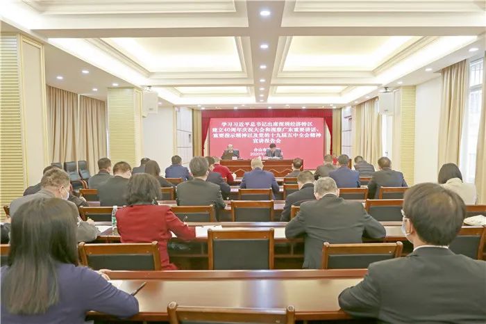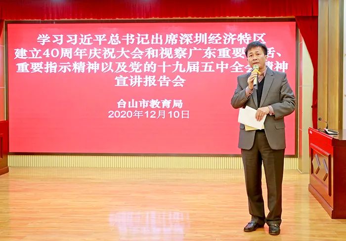 12月10日,市教育局召开全市教育系统学习习近平总书记出席深圳经济特区建立40周年庆祝大会和视察广东重要讲话、重要指示精神以及党的十九届五中全会精神专题宣讲会,局机关全体干部、直属单位主要负责人参加。会议由教育局党组书记、局长李石凑主持。
