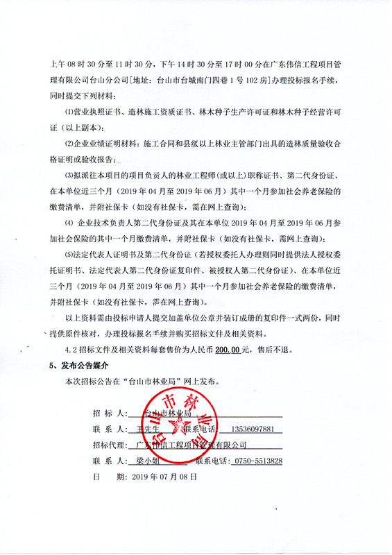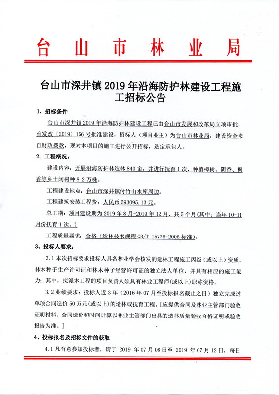 【公告】台山市深井镇2019年沿海防护林建设工程施工招标公告
