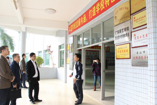 随后,钱杰润局长一行来到广东厨艺技工学校,台山市供销社副主任刘国维和广东厨艺技工学校负责人介绍了学校发展情况,重点汇报“粤菜师傅”工程开展情况。钱杰润在听取汇报并实地视察学校教育设施设备和场地后指出,台山的“粤菜师傅”工程是一项利国利民的重点民生工程,要继续抓紧抓好,抓出成效,同时要用好上级支持的建设扶持资金,进一步改善学校办学环境和提升办学质量,培养出更多“粤菜师傅”。