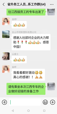 自江门市召开关于开展抓好企业复工复产工作会议以来,为重点做好异地务工人员返岗复工服务,市人社局成立专项工作小组,从系统内抽调精干力量,责任包干,运用“大数据”、批量摸排和重点企业逐个调查的方式,摸清我市近600家“五类”、规上企业和重点项目拟返台山异地务工人员数量以及出行需求。因地制宜,重点筹划广西、湖南、四川、江西、云南5省有意愿返台山返岗的860多名员工的接送工作,分类制定接送方案:一是积极做好省统一安排专列集中运送广西、云南、四川3地异地务工人员返粤返岗的接驳运送工作。二是根据江门有关要求,实行政府组织包车接送,重点将离我省较近的广西、江西异地务工人员集中接返。三是通过给予企业政策补贴,鼓励企业自行包车或企业间组合拼车等方式接送来源相对集中的员工。