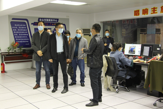 曹志明一行还前往台山市融媒体中心进行交流调研,市委宣传部副部长、市广播电视台机关党委书记、台长陈春华向调研组详细介绍了台山市融媒体中心的建设规划、人员配备、资源整合以及当前运营状况。曹志明对台山市融媒体发展的思路举措、阶段成效以及在疫情期间对人社部门的支持给予充分肯定和感谢。同时他希望在下一阶段融媒体中心能继续支持和配合人社部门,加大对人社部门在复工复产、惠企便民上实施政策的宣传力度,能让更多的企业和群众得到实实在在的帮助。