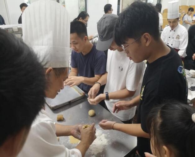随后前往面点实训室学习制作月饼,感受台山传统文化的魅力。听老师详细的讲解制作流程后,青年人才们动手体验月饼制作,称皮、包馅、打模等,一个个香喷喷的月饼,让青年人才们提前感受到在台山过中秋节日的喜悦和温暖。
