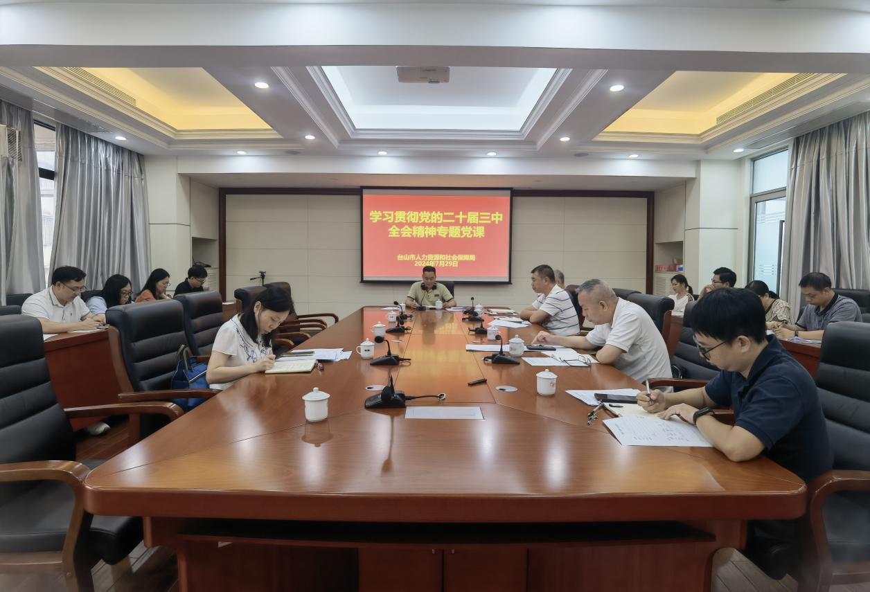 近日,市人社局召开党组(扩大)会议,传达学习贯彻习近平总书记在党的二十届三中全会上的重要讲话精神和全会精神,贯彻落实省、江门、台山有关会议精神,对抓好全会精神的学习宣传贯彻工作进行动员和部署。市人社局党组书记、局长赵湖滨主持会议并就学习贯彻党的二十届三中全会精神作专题党课辅导,局党组班子成员,局内设股室、下属单位负责人参加会议。