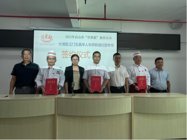 市人社局立足侨乡资源禀赋,以粤菜饮食文化为纽带,举办系列活动、抓好平台建设、谋划合作项目,切实提升“粤菜师傅”品牌国际影响力,推动“粤菜师傅”工程高质量发展。为进一步加强联络,优势互补、信息共享、共同发展,启动仪式上,大湾区江门五邑华人华侨联谊社团团长、巴西江门五邑青年联合总会会长陈文添先生、刚果民主共和国中华总商会会长张琪先生代表所属社团与台山市技工学校签订《侨都赋能友好合作协议书》,在文化交流、粤菜餐饮等方面达成合作意向。