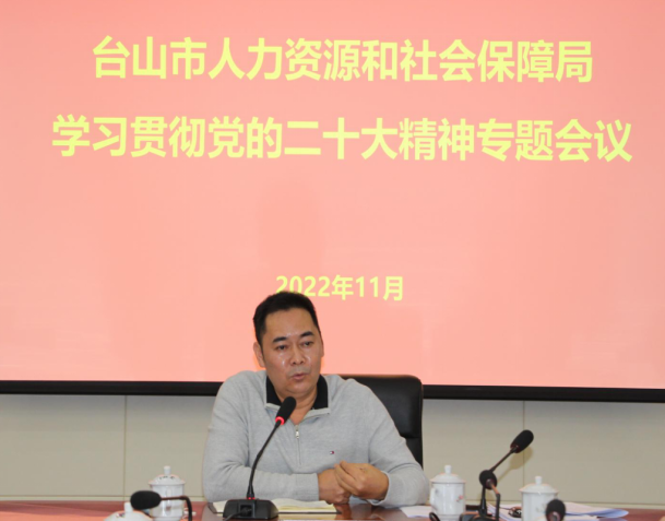 11月7日,市人社局党组召开理论学习中心组(扩大)会议暨学习传达贯彻党的二十大精神专题会议,局党组班子成员及下属单位负责人、党支部书记及局机关中层以上工作人员共40多人参加,局党组书记、局长赵湖滨主持会议。