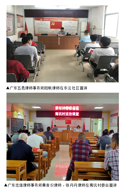 2021年2月25日至26日,台城司法所联系台城辖区内的社区、村委会,邀请广东广能律师事务所林伟堂律师、黄觉慧律师、广东雄军律师事务所李婕律师、广东五邑律师事务所蔡莉雅律师、阳帆律师、广东志信律师事务所黄杏仪律师、张丹丹律师利用村居委会集体颁证会议契机到所驻村居委会展开普法宣传。律师们结合案例,就民法典婚姻家庭编的法律条文向村居干部进行解读,深入浅出地阐述民法典对行政执法的新要求,并现场对村居民密切关注的法律问题进行答复。讲座结束后,在村委会干部的带领下,林伟堂律师深入走访大亨、长岭、香雁湖村小组,了解村民群众的法律需求。