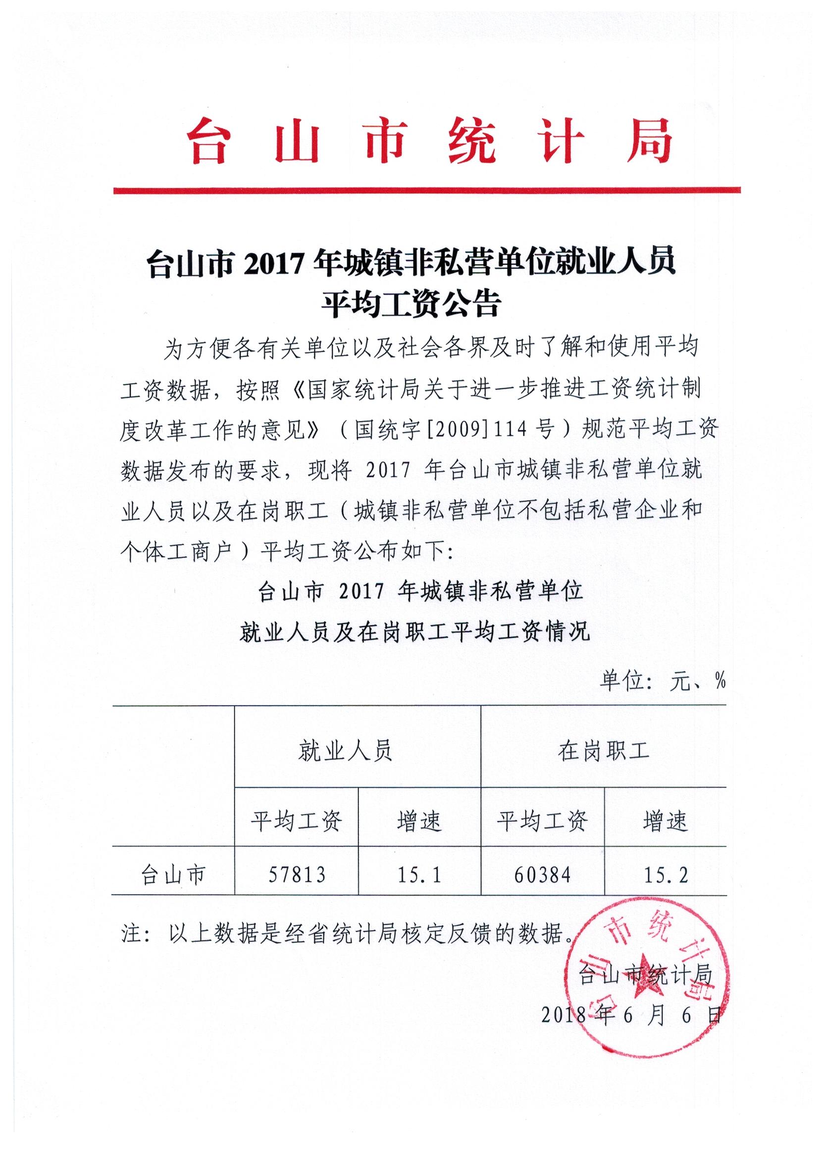 台山市2017年城镇非私营单位就业人员平均工资公告