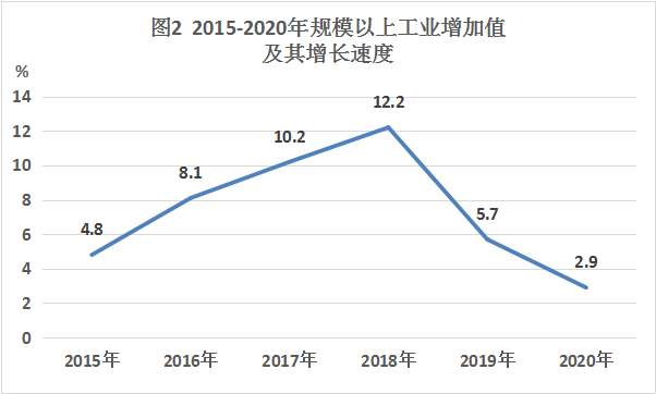 全年规模以上工业增加值比上年增长2.9%。分注册类型看,国有控股企业增长10.0%,外商及港澳台投资企业增长7.0%,股份制企业下降0.4%。分轻重工业看,轻工业下降8.1%,重工业增长6.6%。分企业规模看,大中型企业增长6.4%。