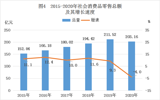 全年社会消费品零售总额203.16亿元,比上年下降4.0%。其中:按规模统计,限额以上社会消费品零售额31.47亿元,下降7.8%;限额以下社会消费品零售额171.69亿元,下降3.2%。