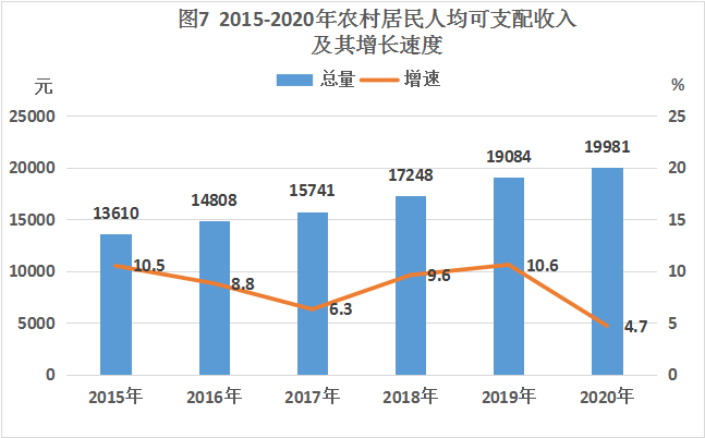 全年农村居民人均可支配收入19981元,比上年增长4.7%。