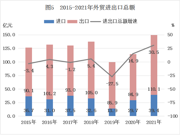 全年外贸进出口总额149.5亿元,比上年增长30.5%。其中,进口总额39.4亿元,增长32.6%;出口总额110.1亿元,增长29.7%。全年实际利用外资1706万美元,下降62.4%。
