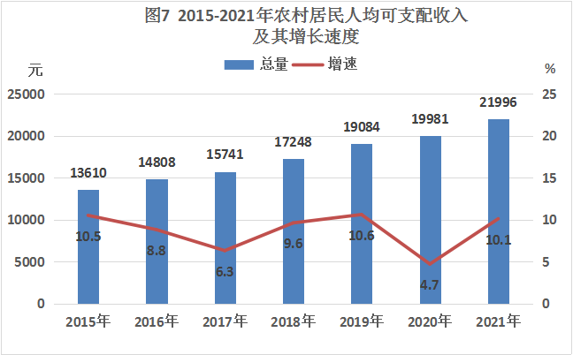 全年农村居民人均可支配收入21996元,比上年增长10.1%。