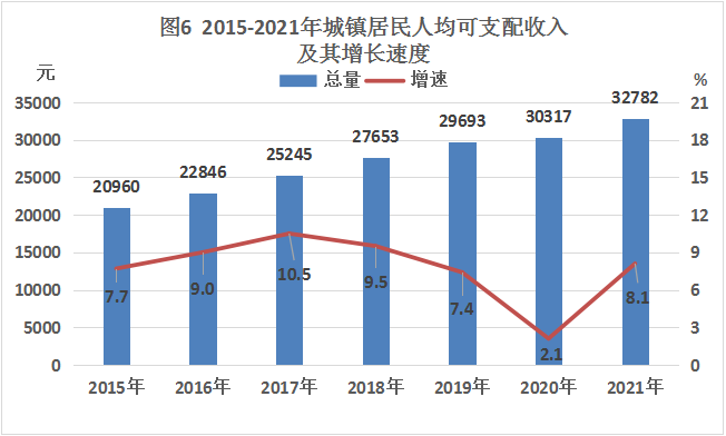 全年城镇居民人均可支配收入32782元,比上年增长8.1%。
