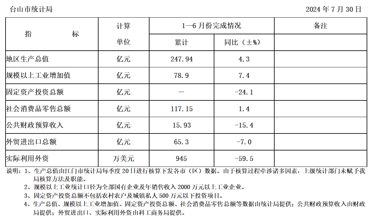 台山市2024年1-6月主要经济指标完成情况