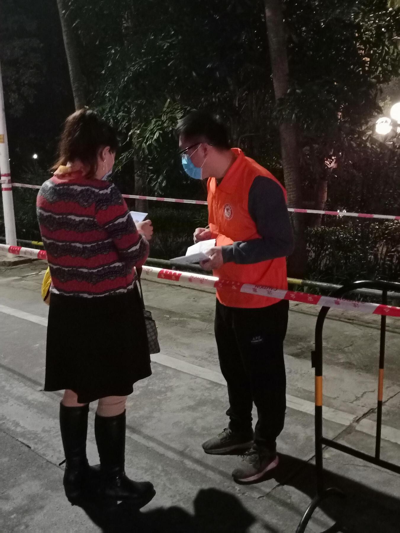 在检测一线,党员志愿者听从指挥分赴各个岗位,协助社区和医护人员维持排队秩序,指导群众使用微信“扫一扫”粤核酸的葵花码,录入核酸检测预约资料等准备工作。对于没有智能手机的老人家,党员志愿者在现场用自己的手机帮老人家形成核酸检测葵花码并打印,引导老人走绿色通道快速完成核酸采样。1月15日核酸检测工作一直持续到晚上12时,当晚天气寒冷,党员志愿者至始坚守岗位,争分夺秒,一刻不停协助做好有关工作,为核酸检测顺利有序高效进行提供了坚实支撑。