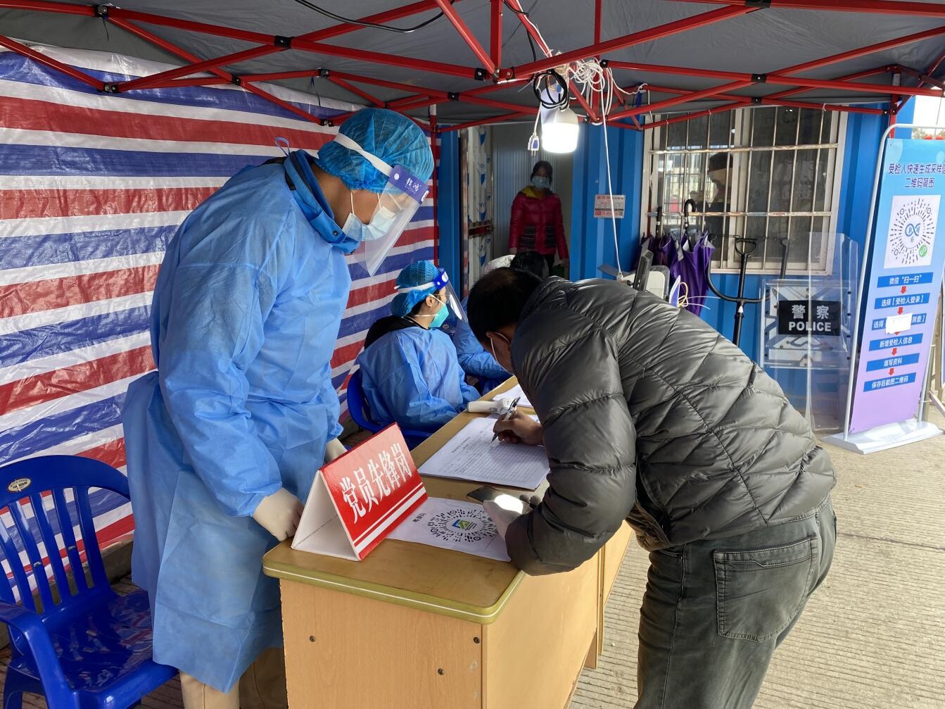 在大江镇高速路口健康服务点,统计党员志愿者认真协助防疫工作人员,对进入台山市的车辆和乘客进行体温检测,并核验其健康码、行程码,做好信息登记。当天虽然天气寒冷,但统计党员志愿者们不惧严寒,坚守防疫一线,为疫情防控筑起一道牢固的“红色堤坝”。