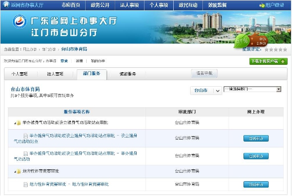 (四)网上办事,便民利民。我局抓好网上办事大厅建设,在体育局网站开设体育审批项目审批窗口,实行简政便民,提高办事效率。同时将有关体育的法律法规全部在台山市体育局网站上进行公布,更好地服务群众。